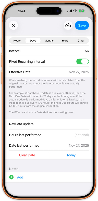 You can specify a "fixed" service interval for service items. This can be used for chart updates and certain other service items. For example, if a chart update is required every 28 days but you do it a few days early or late, the next date will still be 28 days from the specified reference date, not from the actual date.